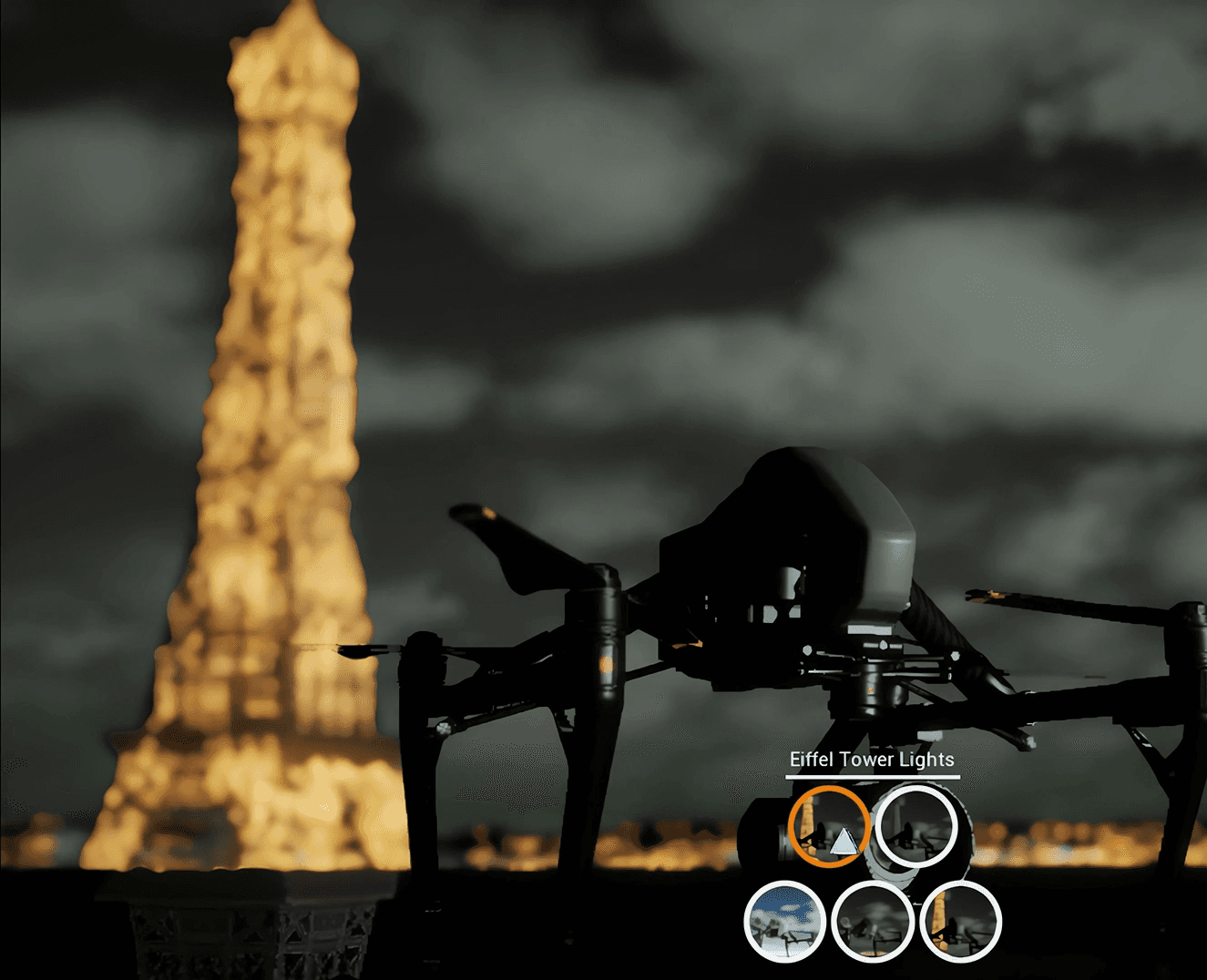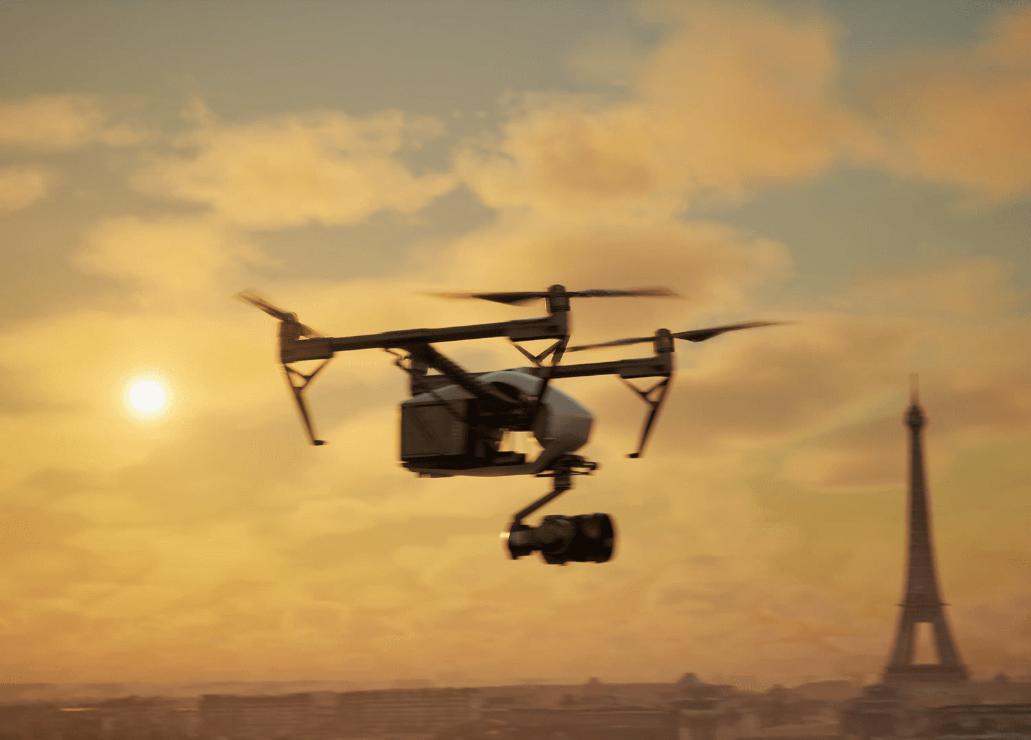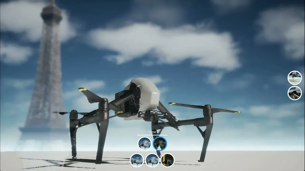 A real-time 3D visualization created in Unreal Engine, showcasing the DJI Inspire 2 in a cinematic flight sequence over Paris, followed by a detailed configuration reveal.